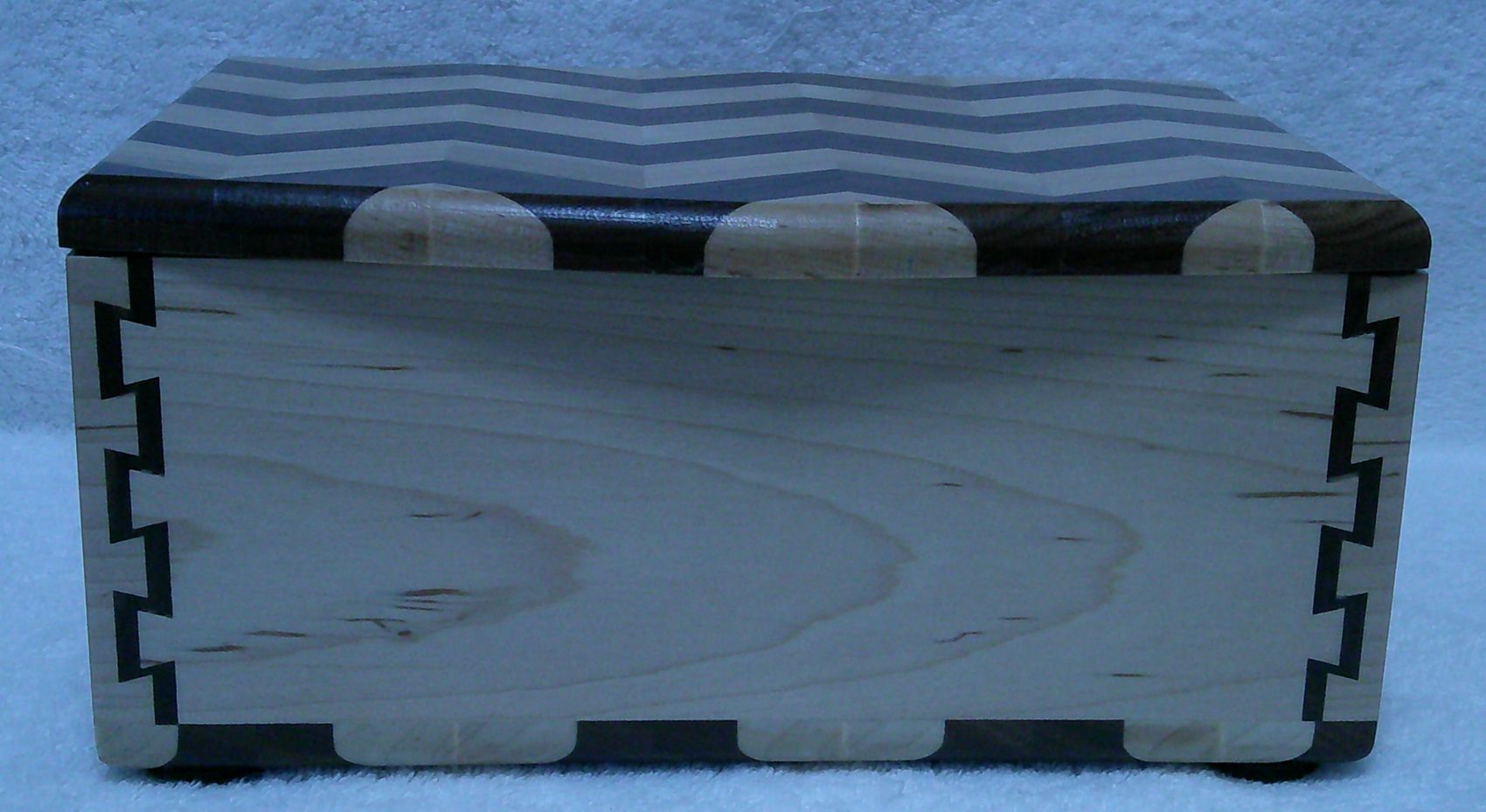 Trinket box. This trinket box is made out of solid maple and walnut, and it has double dovetail corners It has a hinged lid and felt pads on the bottom to protect your tabletop. The trinket box has a brown velvet lined inside bottom. This beautiful trinket box will hold some of your favorite collectables. Dimensions: 10 X 6 1/4 and 4 3/4 inches tall.