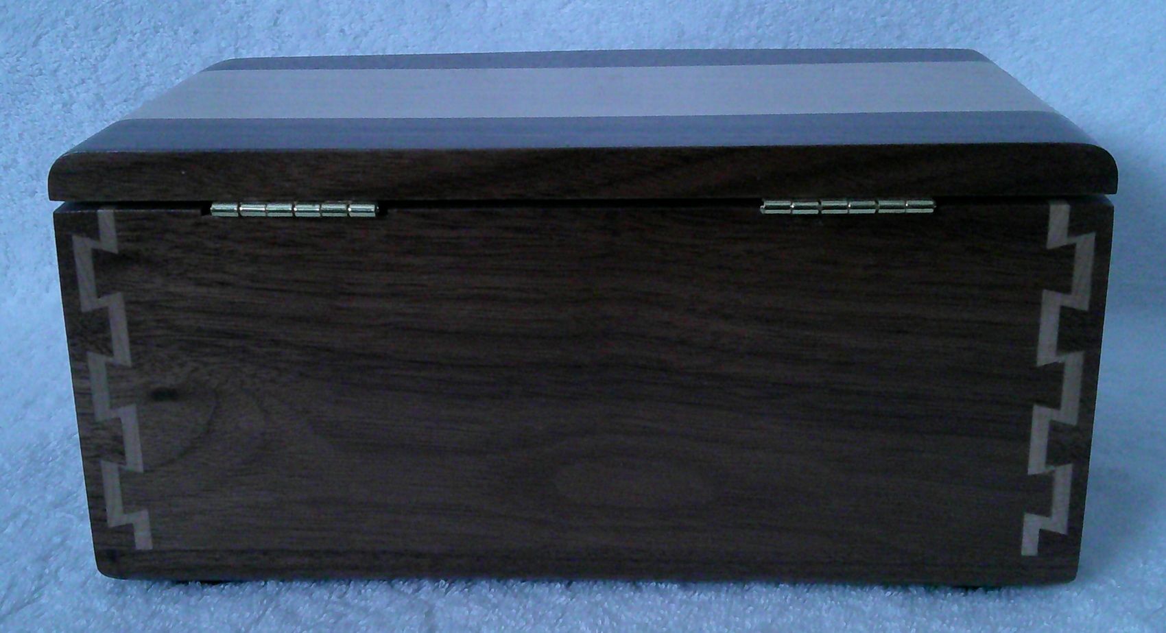 Trinket box. This trinket box is made out of solid walnut and maple it has double dovetail corners It has a hinged lid and felt pads on the bottom to protect your tabletop. The trinket box has a brown color velvet lined inside bottom. This beautiful trinket box will hold some of your favorite collectables. Dimensions: 9 1/2 X 5 3/4 and 4 1/2 inches tall.