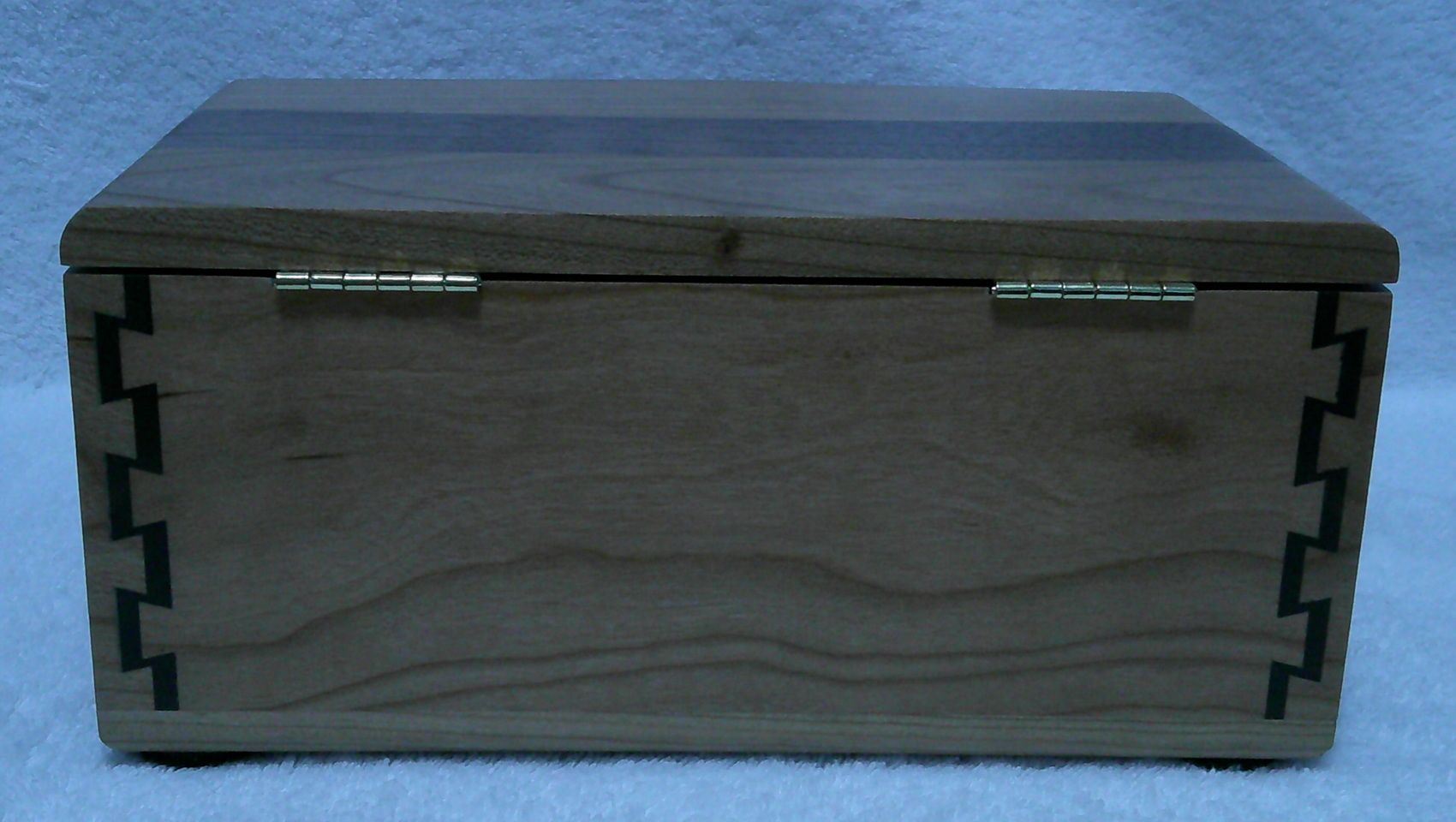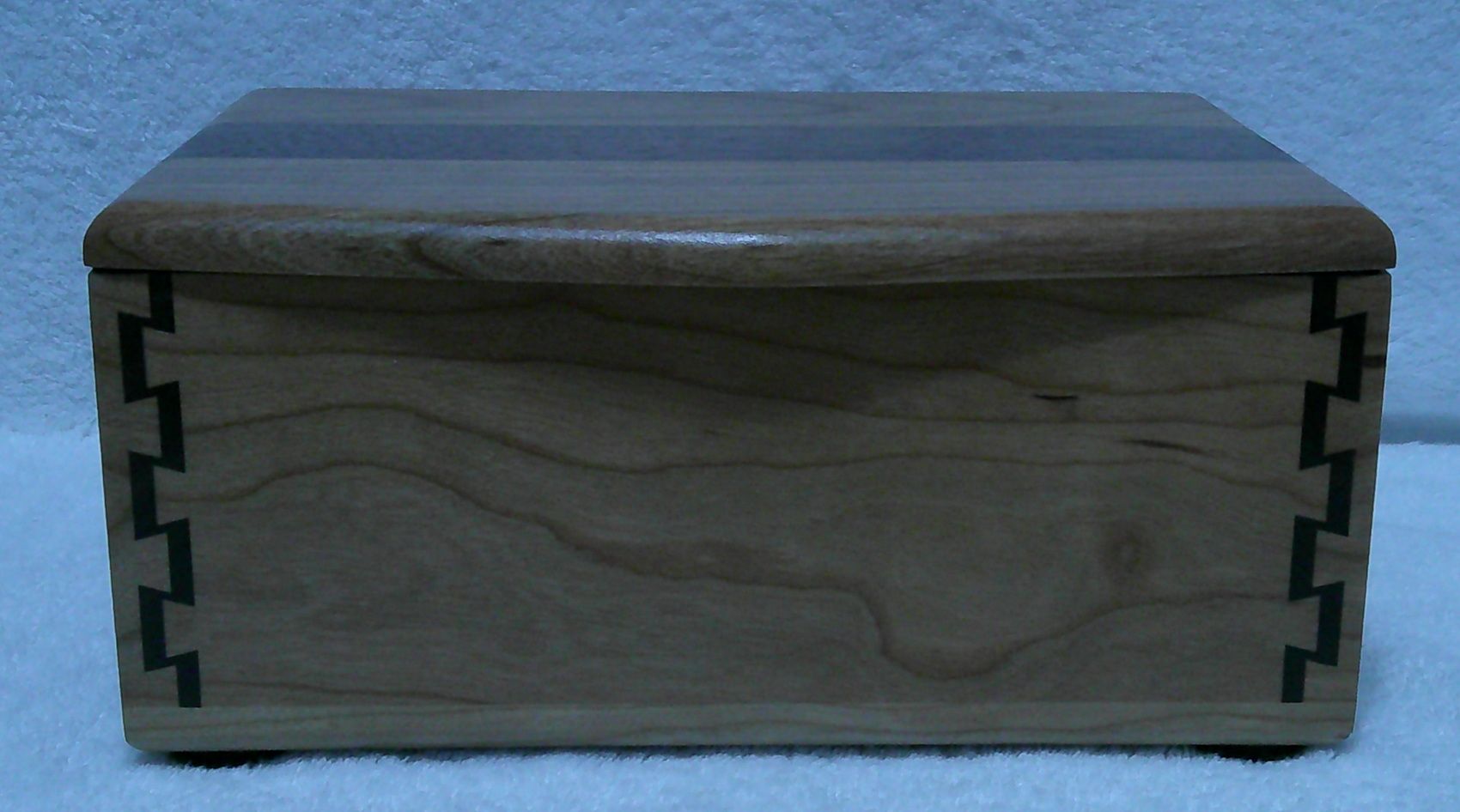 Trinket box. This trinket box is made out of solid cherry and walnut, and it has double dovetail corners It has a hinged lid and felt pads on the bottom to protect your tabletop. The trinket box has a black velvet lined inside bottom. This beautiful trinket box will hold some of your favorite collectables. Dimensions: 10 X 6 1/4 and 4 5/8 Inches tall.