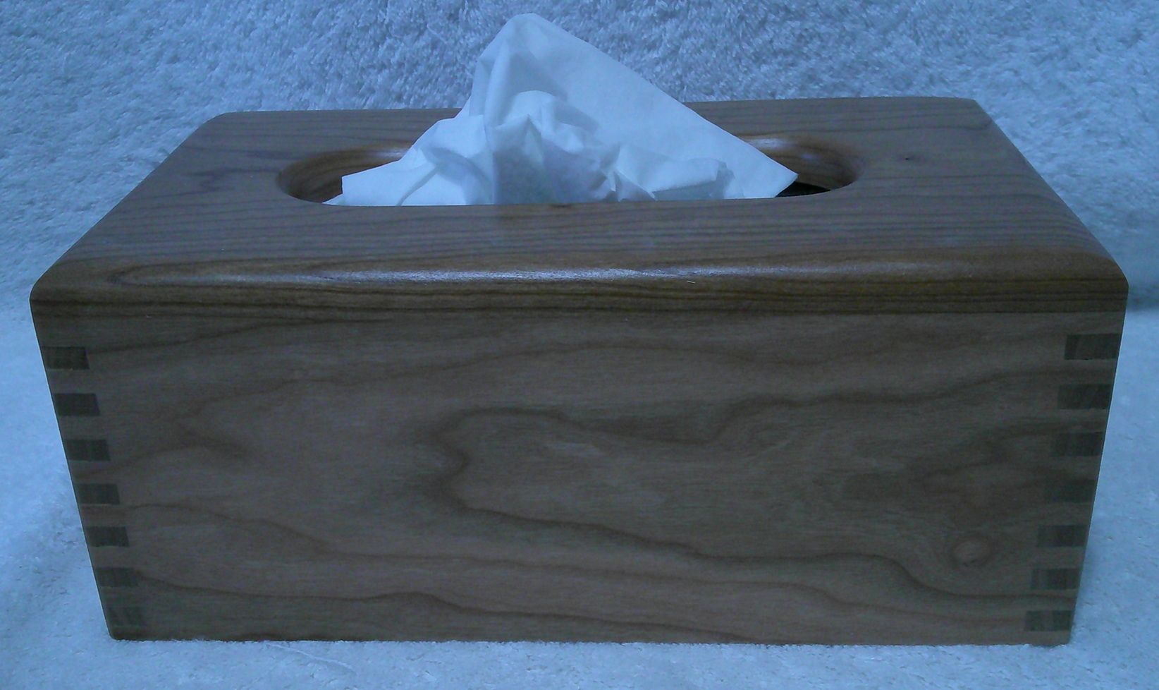 Kleenex tissue box cover. The tissue box cover is made out of solid cherry and finished with several coats of a clear satin lacquer. It has felt pads on the bottom to protect your tabletop. This tissue box cover is made to sit over your existing tissue box. Dimensions: 10 inches X 5 7/8 and is 4 1/4 inches tall. Inside dimensions: 9 X 4 7/8 and is 4 1/8 inches tall. Tissue is not included.