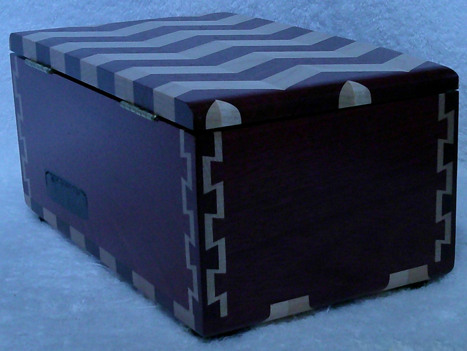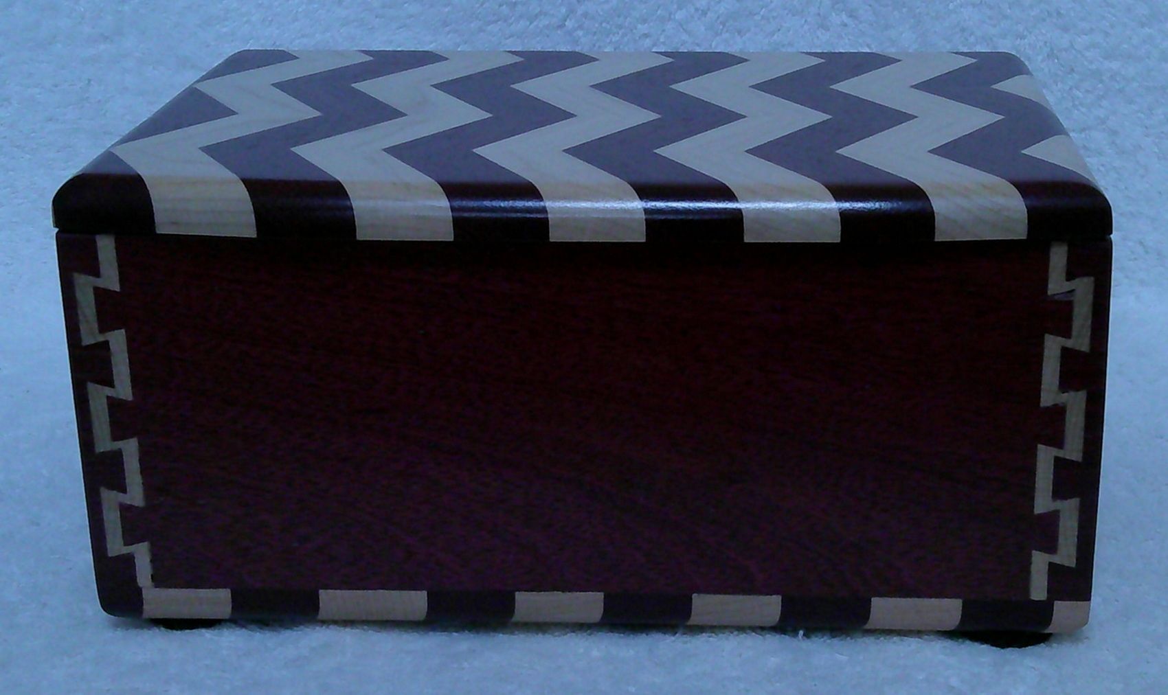 Trinket box. This trinket box is made out of solid maple and purple heart, and it has double dovetail corners optical illusion lid and bottom It has a hinged lid and felt pads on the bottom to protect your tabletop. The trinket box has a dark green color velvet lined inside bottom. This beautiful trinket box will hold some of your favorite collectables. Dimensions: 10 X 6 1/4 and is 4 3/4 inches tall.