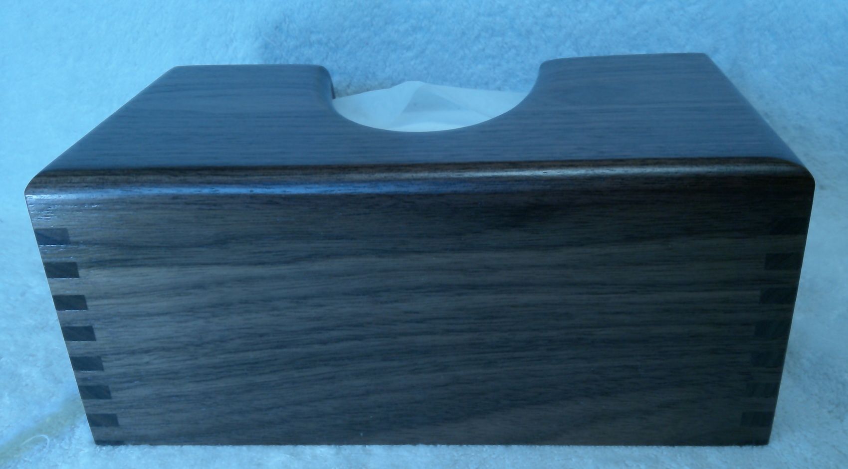 Puffs tissue box cover. The Puffs tissue box cover is made out of solid walnut and finished with several coats of a clear satin lacquer. It has felt pads on the bottom to protect your tabletop. This Puffs tissue box cover is made to sit over your existing Puffs tissue box. Dimensions: 10 X 5 7/8 and is 4 1/4 inches tall. Inside Dimensions:9 X 4 7/8 and is 4 inches tall. Tissue is not included