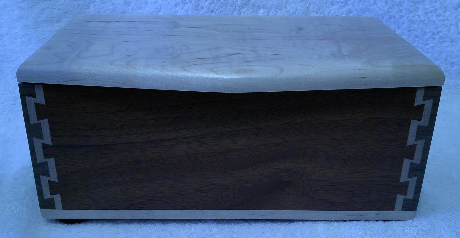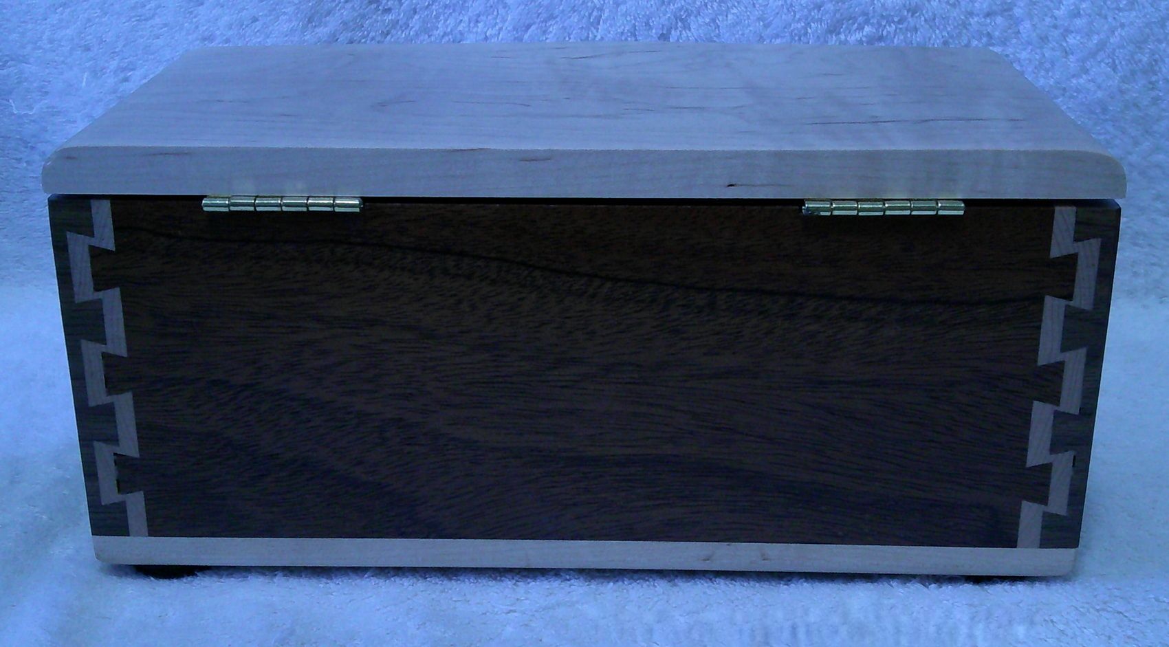 Trinket box. This trinket box is made out of solid maple and walnut, and it has double dovetail corners It has a hinged lid and felt pads on the bottom to protect your tabletop. The trinket box has a brown color velvet lined inside bottom. This beautiful trinket box will hold some of your favorite collectables. Dimensions: 10 3/8 X 5 and 4 5/8 inches tall.